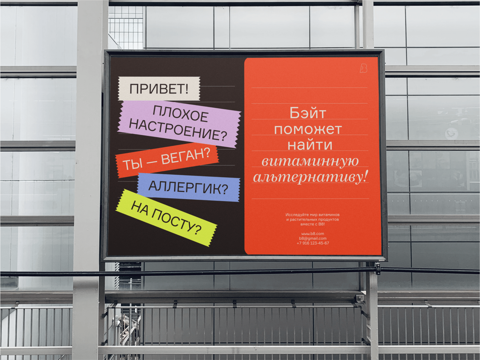 Логотип представляет собой знак, в котором можно прочесть как символ B, так и символ 8, из которых состоит название медиа-сервиса. Будучи отсылкой к точности и выверенности научных данных, он был построен словно по линейке.