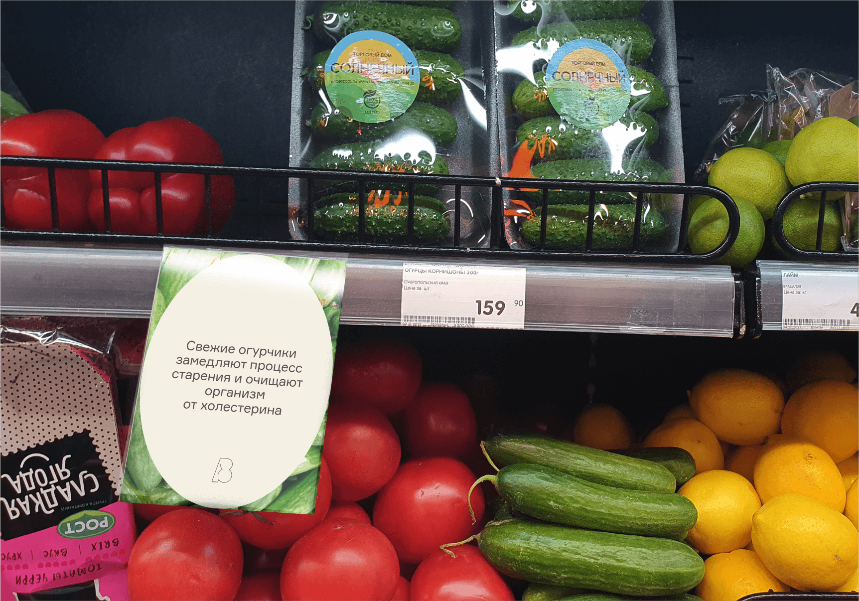Продукты находятся на прилавке, кадр охватывает большое пространство. Съемка осуществляется фронтально.